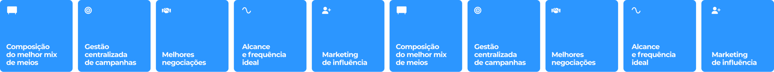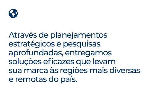 Com mais de 10 anos de experiência no mercado publicitário, somos especialistas em inteligência de mídia, com foco em planejamento estratégico e gestão integrada. Somos reconhecidos nacionalmente pela regionalização eficaz de campanhas e pela entrega de soluções sob medida, seja para agências ou empresas de todos os portes. Atuamos como uma empresa independente, oferecendo consultoria estratégica, operacionalização e distribuição de campanhas em todos os meios e regiões do Brasil. Nosso compromisso é conectar marcas aos seus consumidores, onde quer que eles estejam.